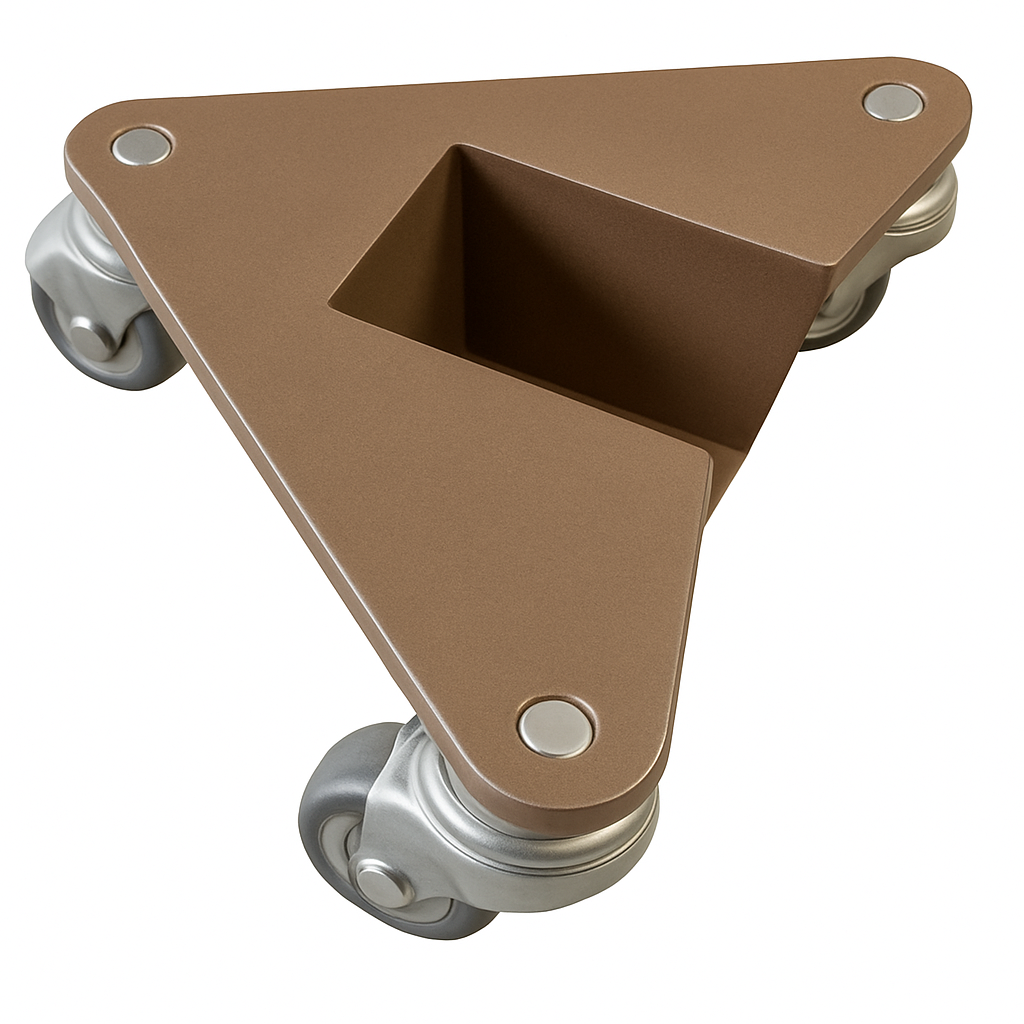 Coins roulants surbaissés – 600 kg (jeu de 4) Coins roulants en acier haute résistance, conçus pour le déplacement de charges lourdes jusqu’à 600 kg. Idéals pour les machines, armoires ou équipements industriels. Structure en acier robuste Trois roulettes pivotantes Ø50 mm en caoutchouc sur roulements à billes Dimensions utiles : 132 × 132 mm Hauteur totale : 85 mm Poids total du jeu : 8 kg